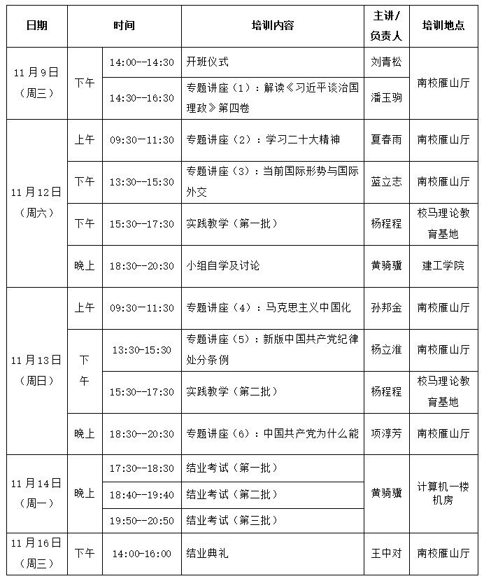 本次培训定于11月9日-16日举行,具体时间和课程安排(暂定)见下表。